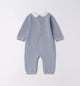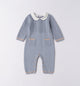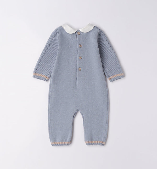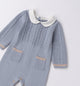 Blue knit long sleeve romper style babygrow. Featuring cable knit stitching to the chest area and arms. Pocket detail with beige trim and beautiful white collar.