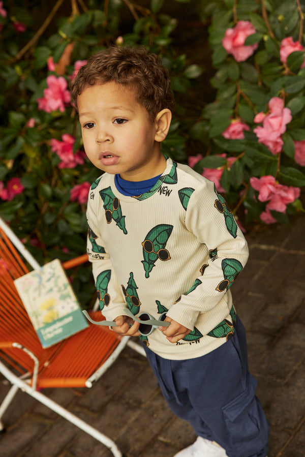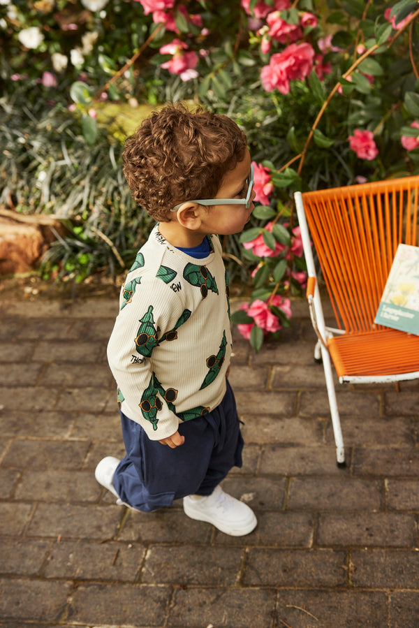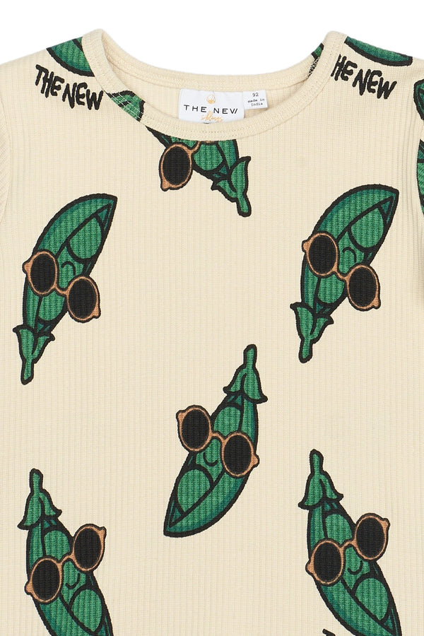 Smart long-sleeved rib-knitted baby blouse from THE NEW siblings. This simple sweater is perfect for everyday outfits or cozy moments at home. Additionally, the sweater features a cool pattern of funky peas wearing sunglasses. Pair it with the matching TNSTNevi leggings for a stylish set.