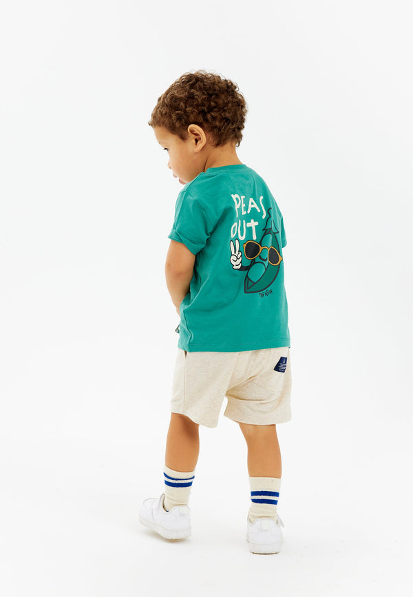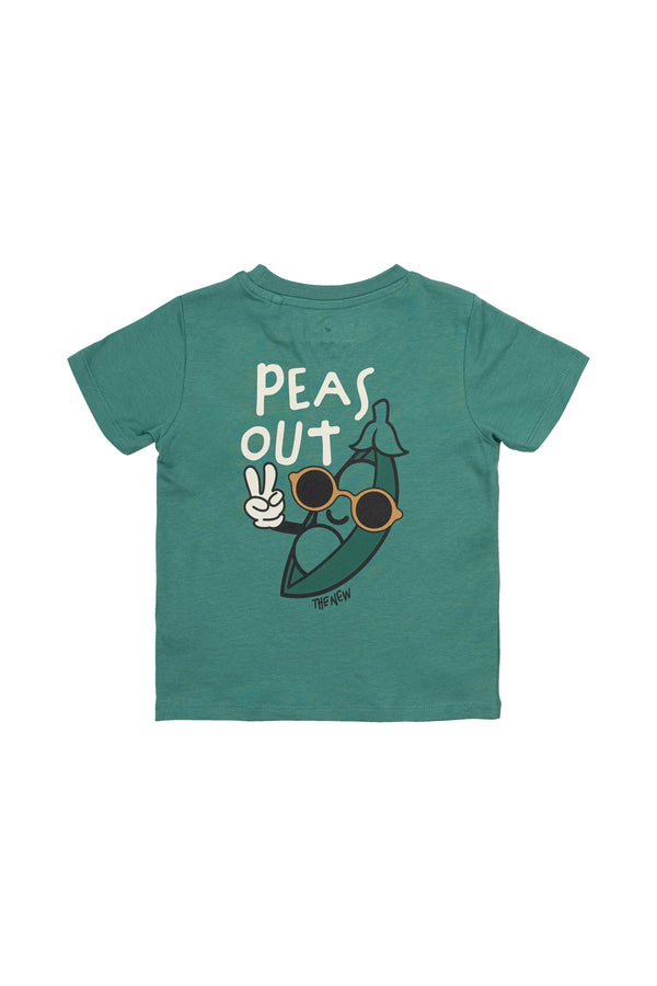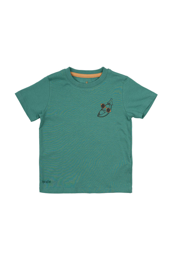 Short-sleeved green baby t-shirt with a small print on the chest of a cool pea pod with sunglasses. This simple t-shirt from THE NEW siblings is perfect for everyday wear and can be styled with many different bottoms.