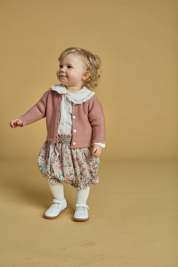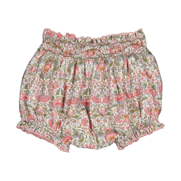 The Myrtille smocked bloomer, a delightful addition to your little one's wardrobe by Kidiwi, featuring an enchanting pink and green floral print that adds a touch of colour and elegance. Made from 100% cotton for optimum comfort.