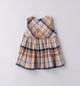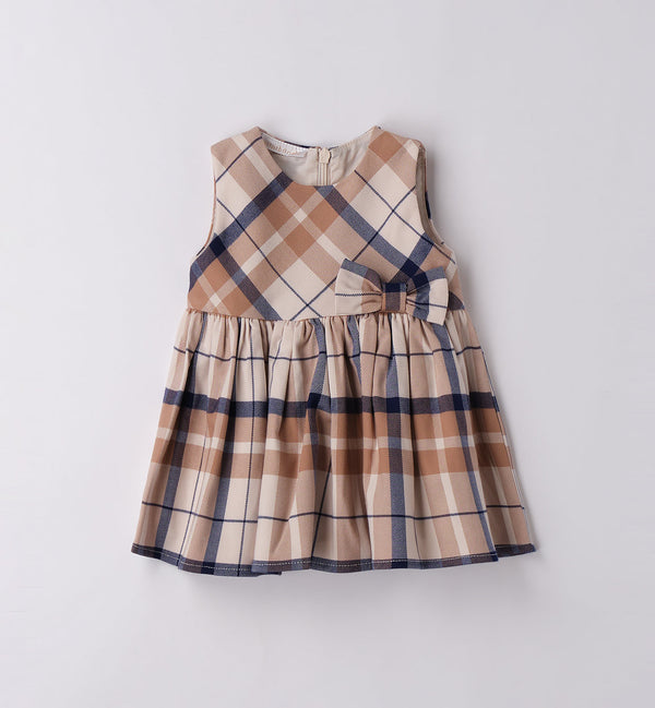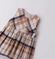 A beautiful tartan in creams and blues sleeveless dress. Featuring a pleated skirt and large bow to the front. Zip Back detail. Ideal to pair with a long sleeve white top and the MB Glitter Navy cardigan for special occasion or the festive season.