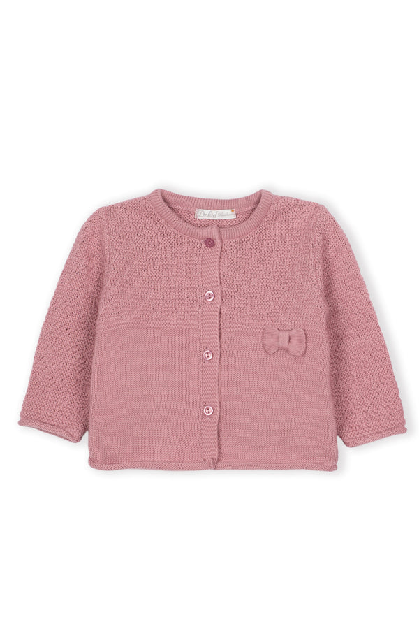 A soft pink wool blend cardigan with open work knit and bow detail. A versatile cardigan to pair over an outfit or dress.
