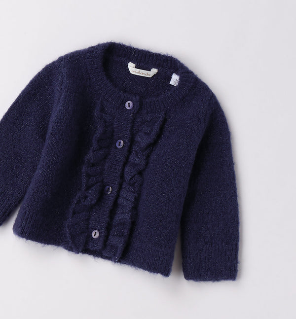 A beautiful wool blend navy knit cardigan with front ruffle detail, ideal to pair over an occasion dress. Featuring a glitter stitch running throughout to make it extra special and dress up an outfit.