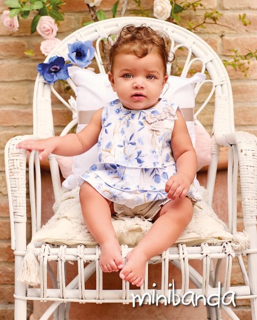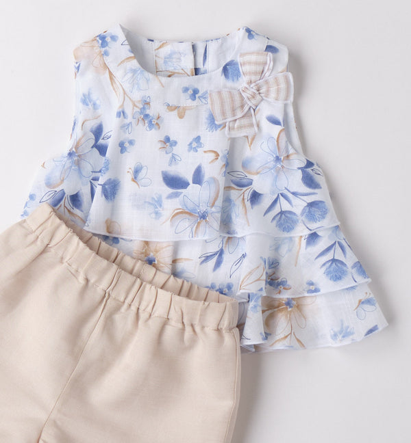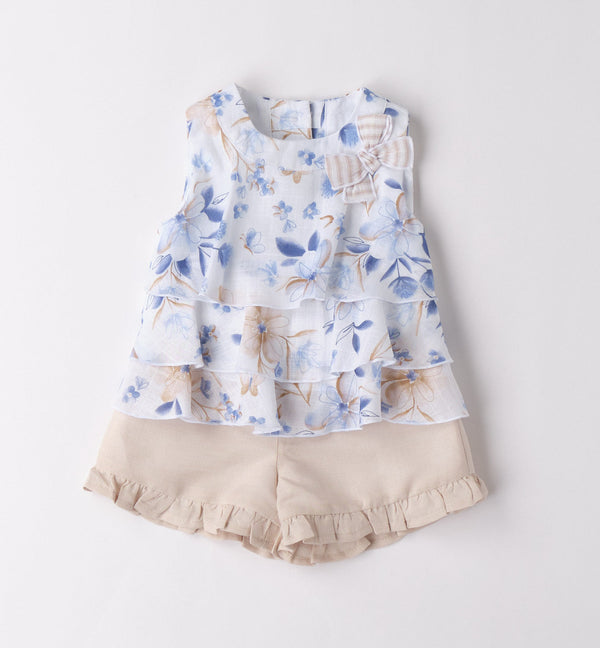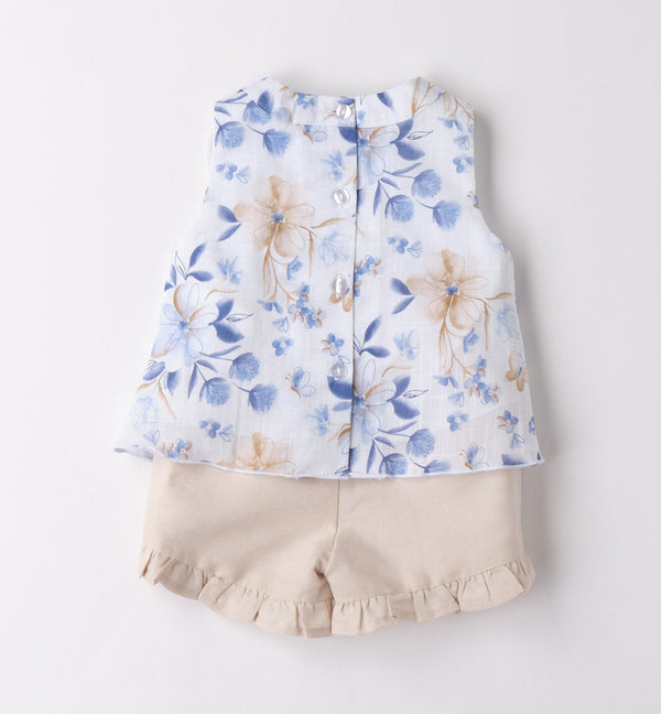 Blue Floral print top and natural linen shorts set. Sleeveless tank top with button back detail and ruffle hem detail. Elasticated waistband natural shorts with matching ruffle hem. Ideal for sibling matching with MB Blue Floral Dress and boys Floral shirt.