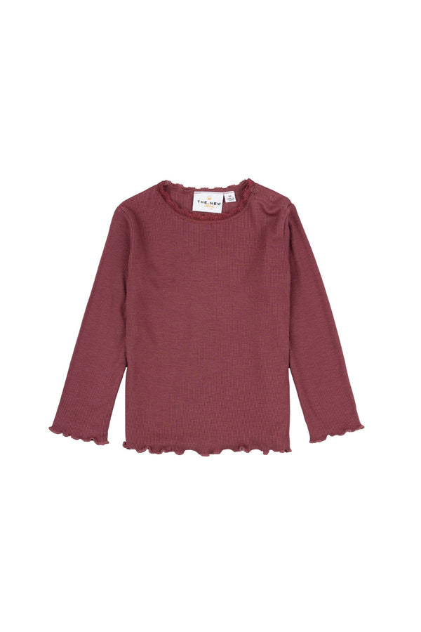 Long-sleeved baby blouse in a soft and stretchy ribbed knit quality with lace details at the neckline. It's a versatile basic top that offers a variety of outfit options and is comfortable to wear in the summer heat.