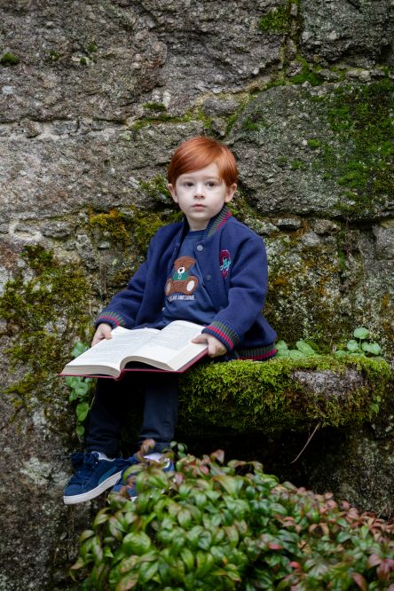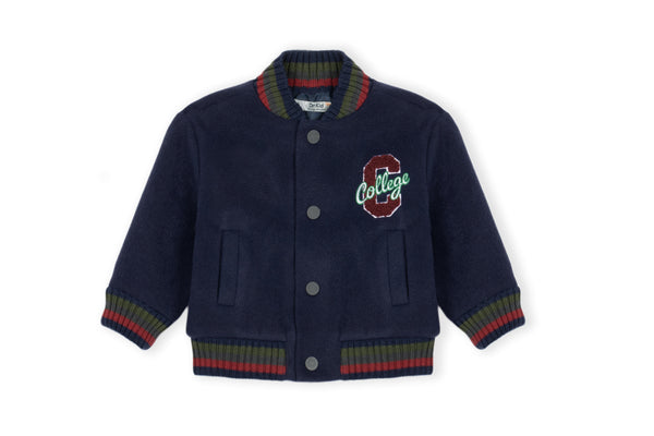 This cool bomber varsity style jacket from Dr Kid is a great piece to have in any little boys wardrobe this winter. It can be used as a smart jacket or else be used to layer as a cardigan. green and red strip detail to collar, waist and cuffs allows you to pair it with pleat of different chino options.