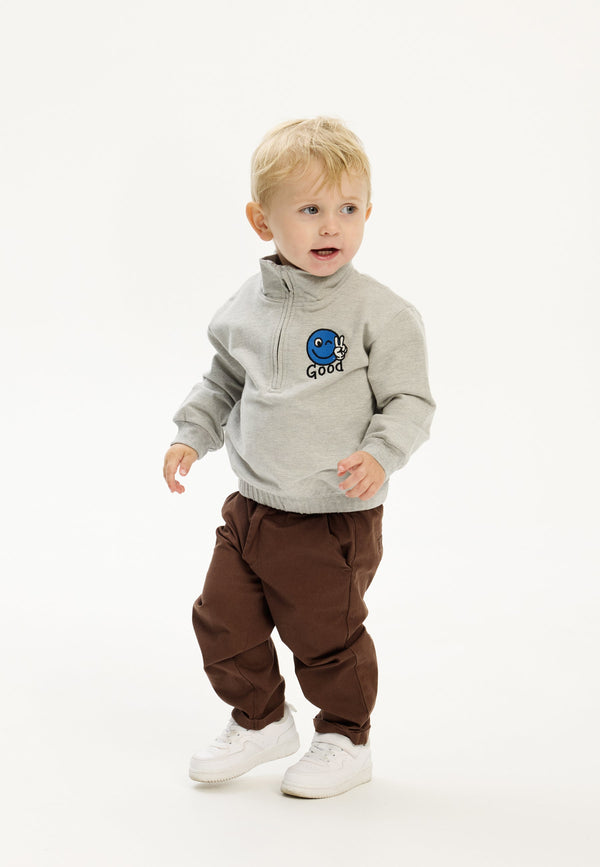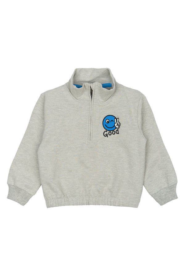 This long-sleeved oversized sweatshirt from THE NEW Siblings combines functionality with a fun design. It features a high collar with a zipper for extra comfort and warmth, along with an embroidered design on the chest with a cheerful blue smiley and the text "GOOD." The ribbed details at the sleeves and hem ensure a great fit and a relaxed look. Made from a soft and durable fabric, this sweatshirt is perfect for both everyday wear and activities.