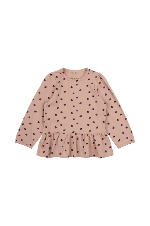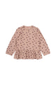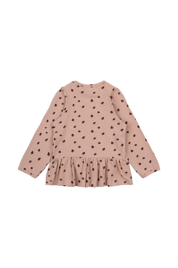 Long-sleeved baby sweater with cute ladybugs embroidered all over. The sweater also features a delicate ruffle detail at the bottom, adding a sweet and feminine touch.