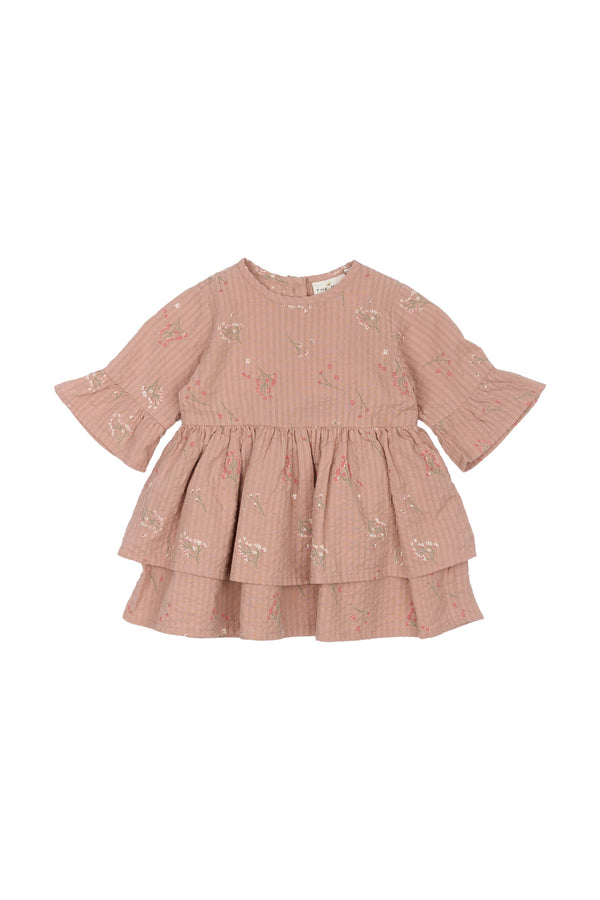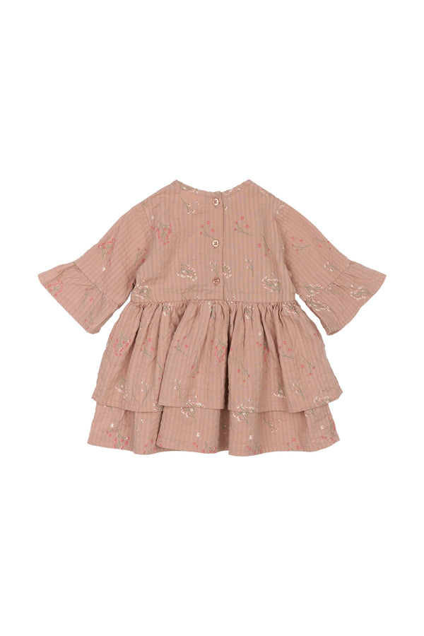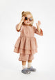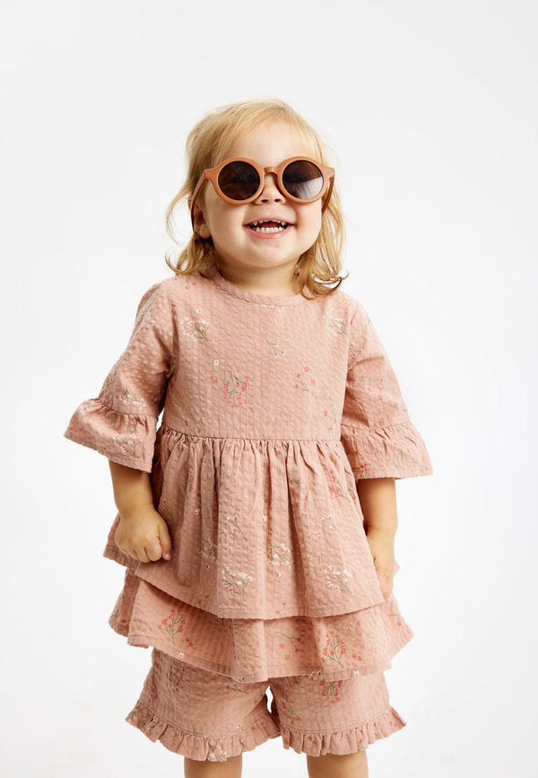 This elegant long top from THE NEW siblings is made of seersucker fabric, giving it a light and textured surface. It features a cute layered design with two ruffle layers that add volume and a romantic feel to the top. The sleeves are short and end with a subtle ruffle detail that matches the layered skirts. The top is in a soft, dusty pink color with a delicate pattern of small, intricate flowers, giving it a feminine look. For example, pair the top with TNSTOline shorts for a stylish summer outfit.