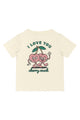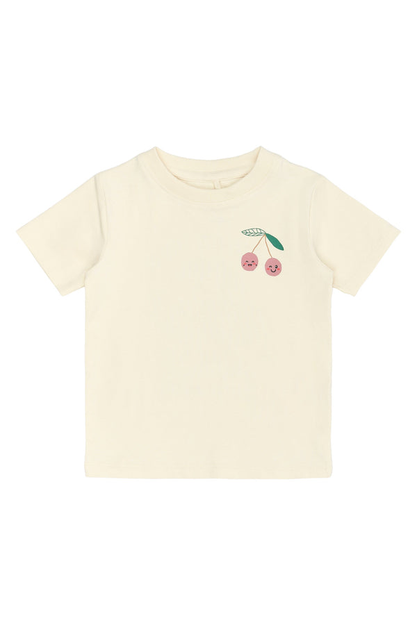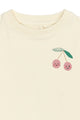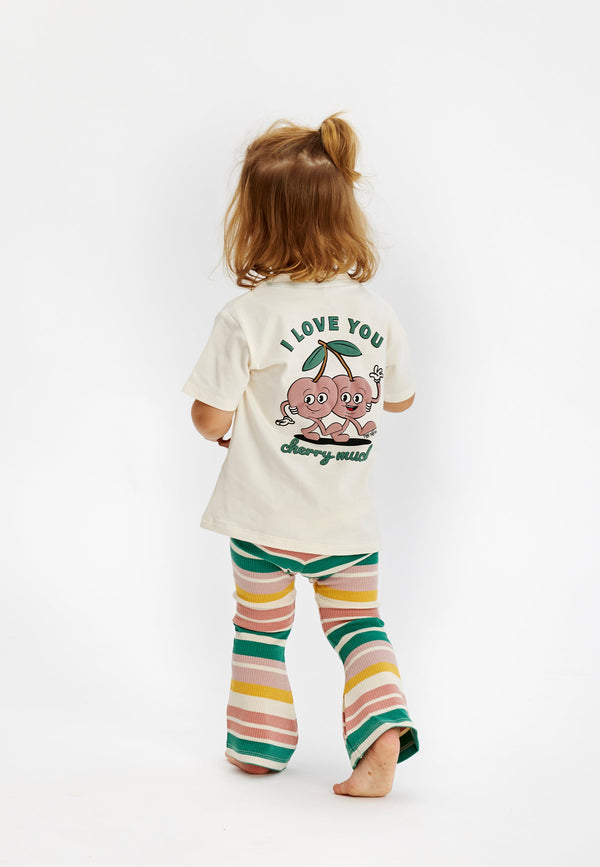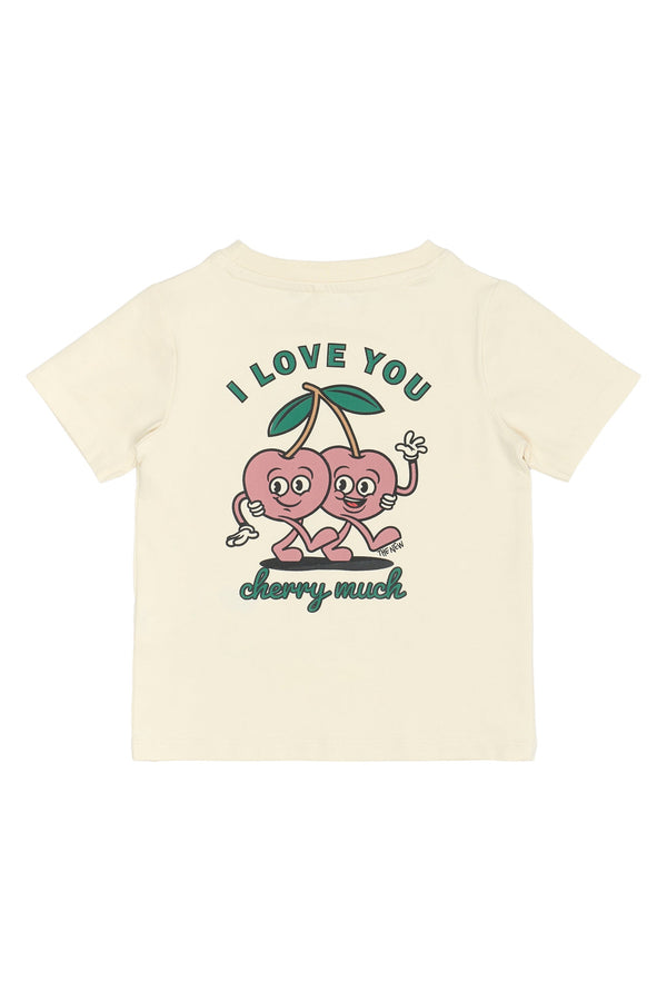 Short-sleeved baby tee with a sweet little chest print of some cute smiling cherries. On the back there is a larger print of the cherries with the wordplay 'I Love You Cherry Much'. It is a t-shirt that fits a lot of different bottoms. A perfect choice for the wardrobe!