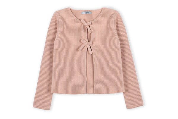 Dusty Pink bow detail cardigan. This woold blend cardigan would be perfect to pair over high waisted wide leg jeans or skirt for a style outfit for older children.