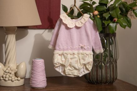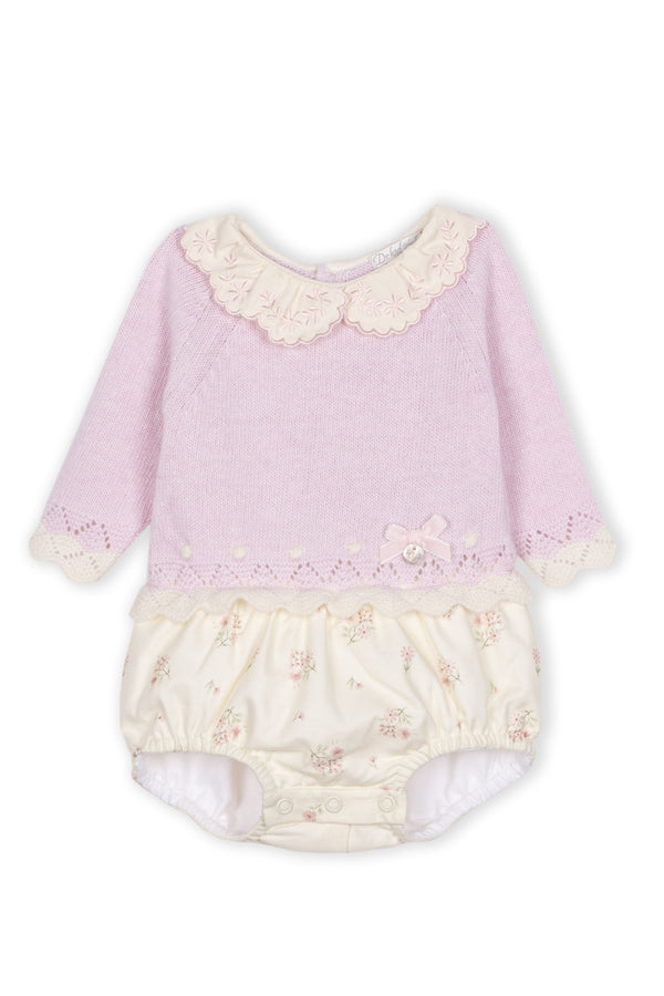 Baby Romper Outfit, Pink knit top in the finest Italian Wool with beautiful embroidery collar detail.