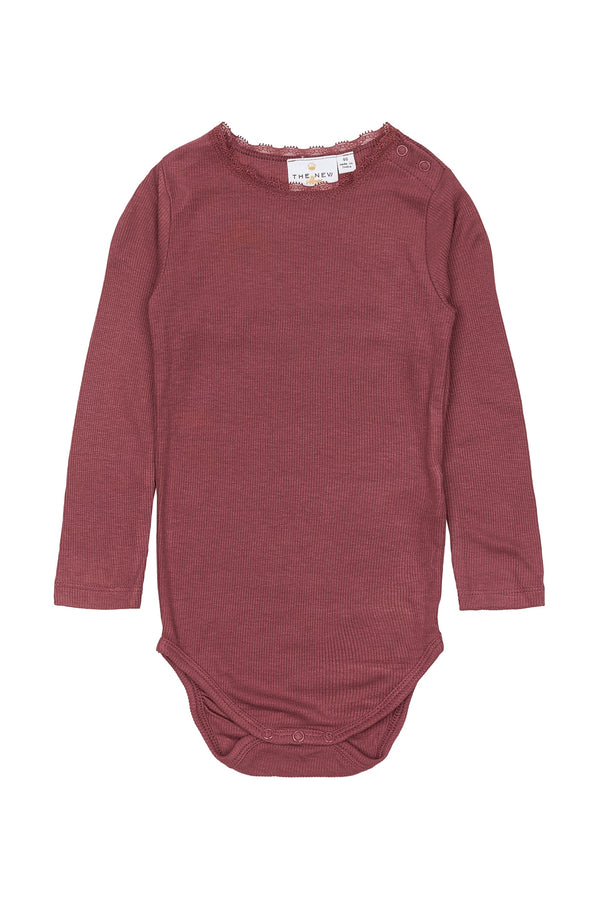 Solid-colored and stylish long-sleeved rib-knit bodysuit from THE NEW. This bodysuit is made from a thin, lightweight, and silky-soft quality fabric, offering a close-fitting silhouette and a timeless design. It's a simple, versatile, and elegant bodysuit suitable for both everyday wear and as a fine base layer for festive outfits.