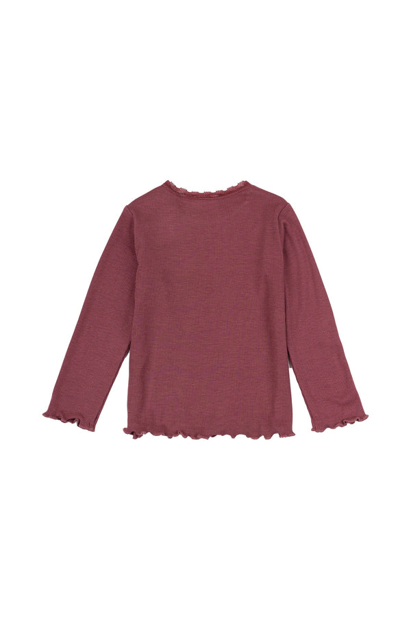 Long-sleeved baby blouse in a soft and stretchy ribbed knit quality with lace details at the neckline. It's a versatile basic top that offers a variety of outfit options and is comfortable to wear in the summer heat.