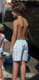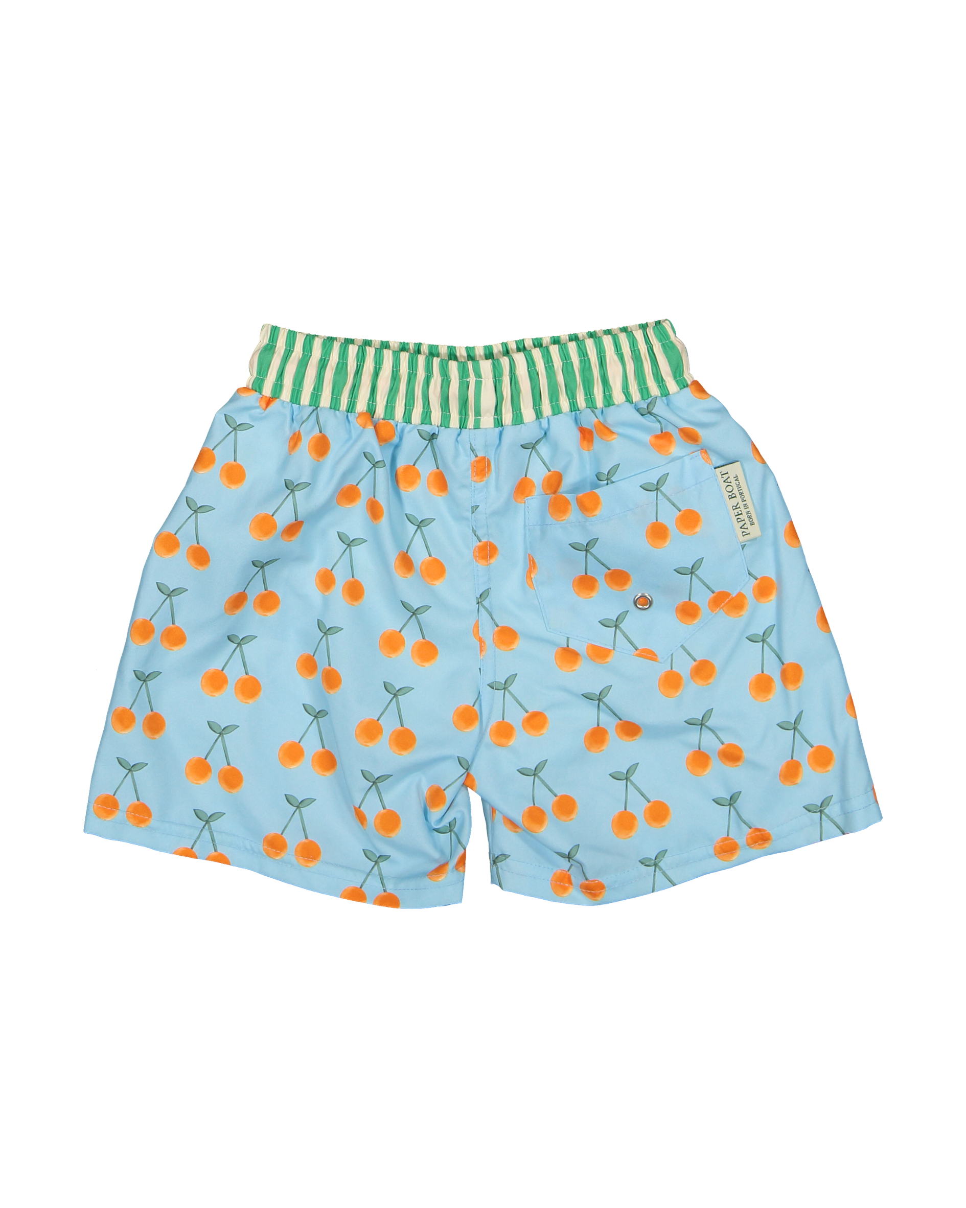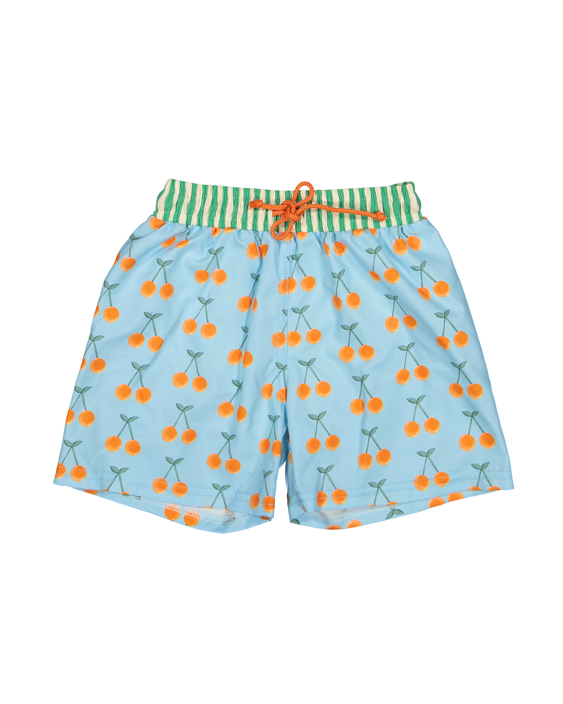 | Boy´s swim trucks in cherry pop pattern with pop stripes waistband. Colors: blue, orange and green. Classic model with elastic waistband and adjustable orange drawstring. Composition: shorts - 100% polyester (57% of this is recycled polyester), Super soft lycra underpants - 80% polyester, 20% spandex. Fabric with quick drying treatment and UPF 50+ . This model fits small. Message me for sizing questions and if in doubt, choose the size above. For family looks, match with the boy´s pop stripes swim shorts, the girl´s cherry pop and pop stripes swimsuits and |