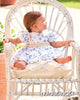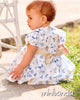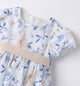Blue floral print summer dress. Round next with puff sleeve detail. A natural linen ribbon belt detail and zip back. Lined and with an extra layer to give it beautiful structure and swing for twirling! Matches perfectly with the boys Floral shirt and also the girls tank and shorts set if looking for some sibling matching.