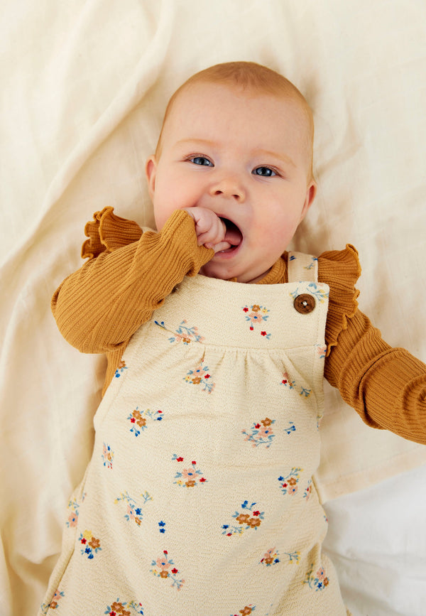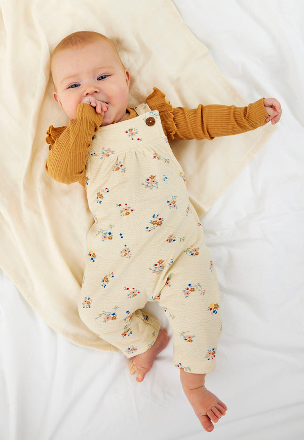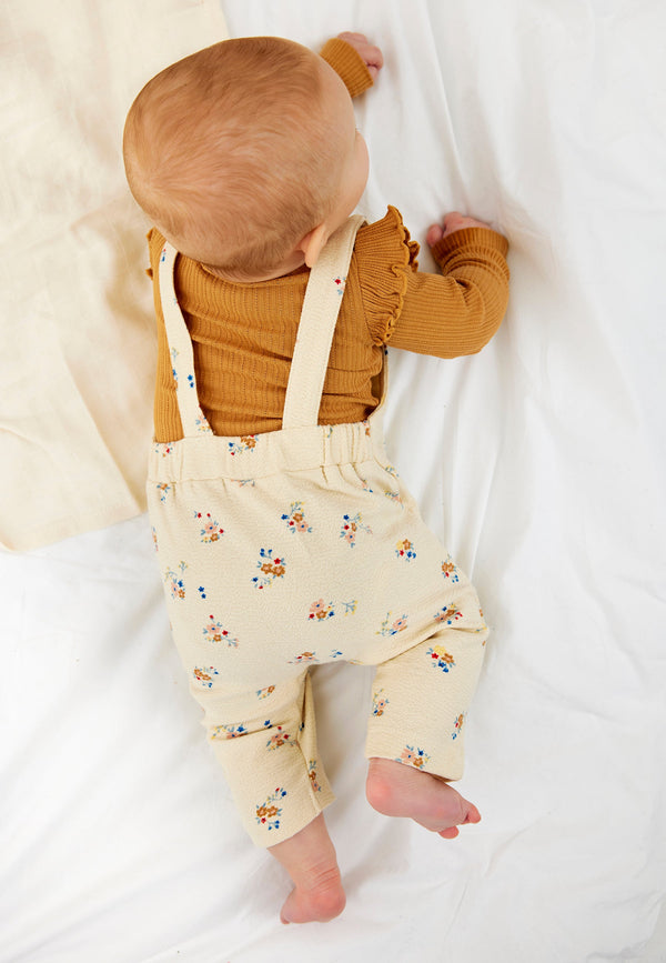 Charming overalls with small delicate flowers. These cute overalls are comfortable, soft, and elastic for effortless movement and play. They have a lovely fit and are perfect for everyday use.