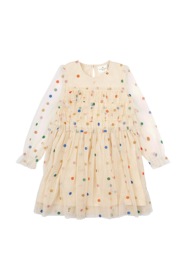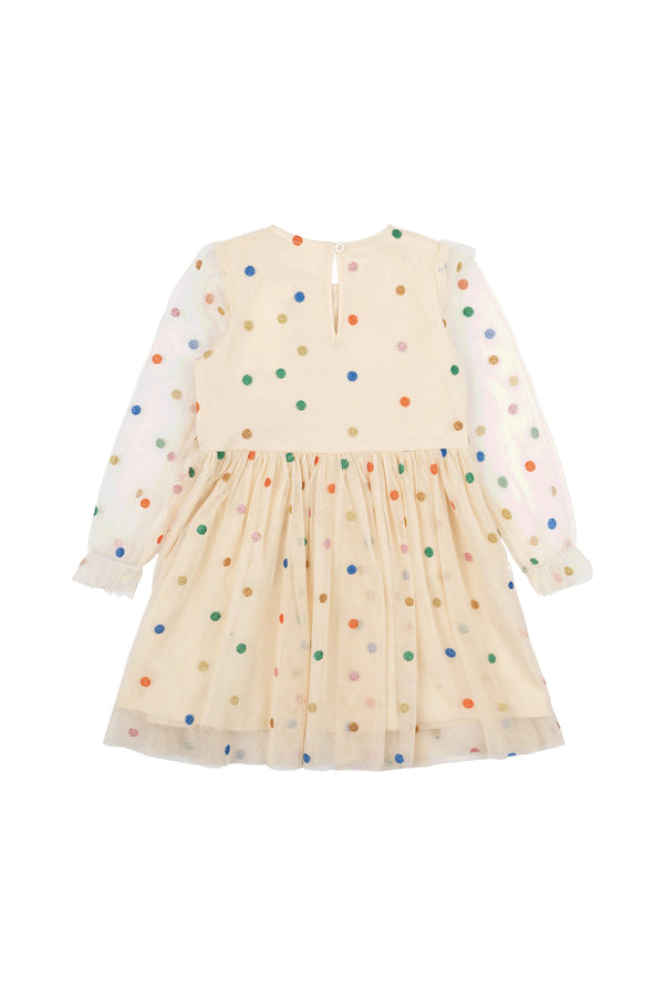 Enchanting THE NEW siblings dress that will delight any little girl. The feminine ruffle details give the dress an extra adorable expression. This lightweight and sparkling mesh dress with colorful dots is the perfect party dress or for other special occasions.