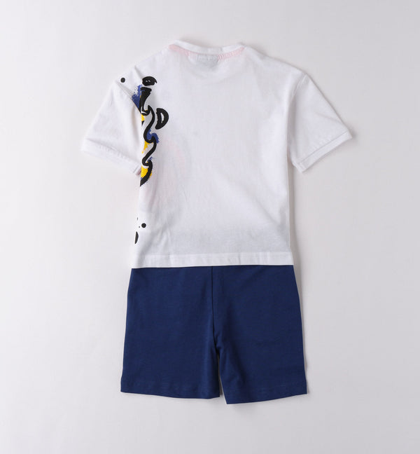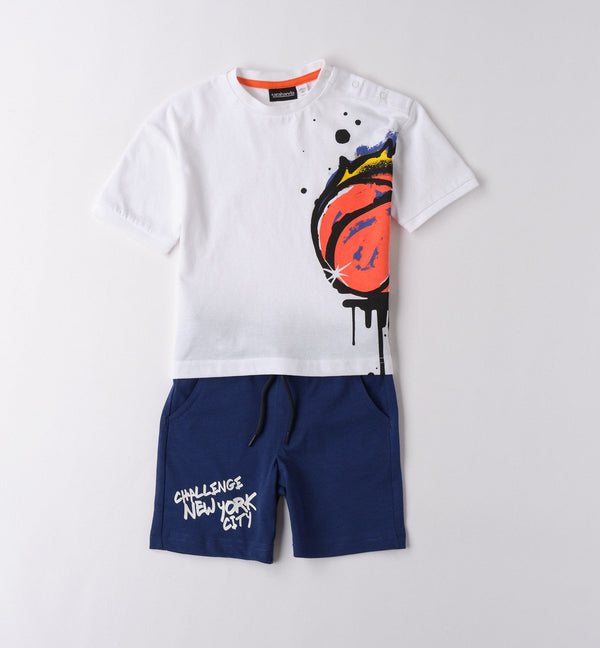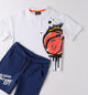 White T-shirt and Navy Shorts 2 piece set. T-shirt featuring a Basketball Graffiti print details. Drawstring and elasticated waist band shorts.