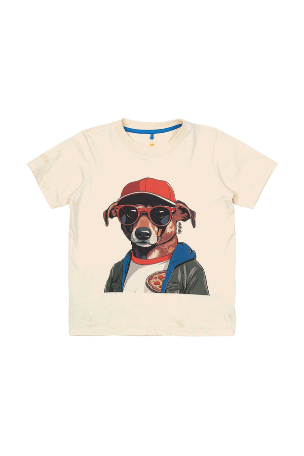Smart t-shirt from THE NEW with a cool print on the front of a stylish dog with a cap and sunglasses. The perfect choice for the boy who loves the street look and a colorful print. The t-shirt is comfortable and is a versatile addition to the child's wardrobe.