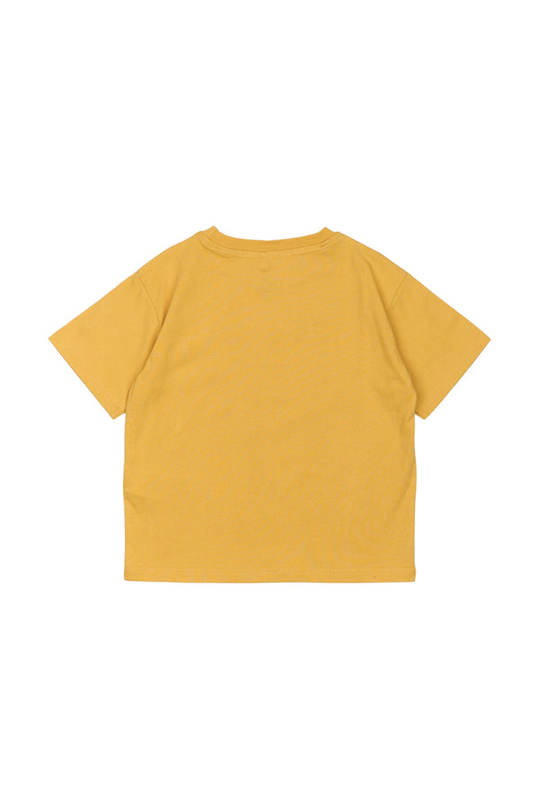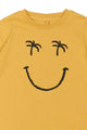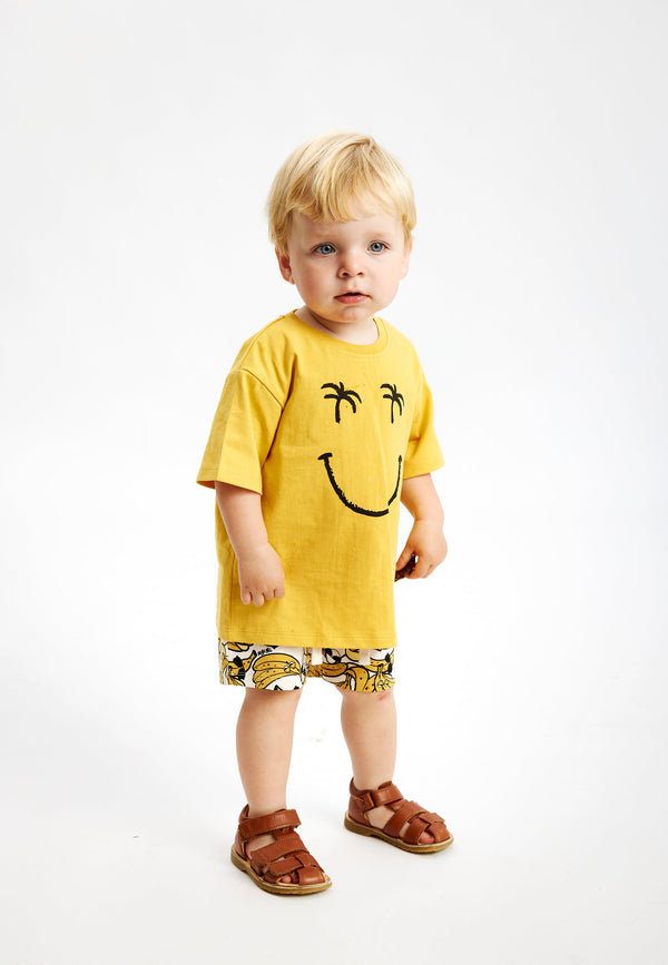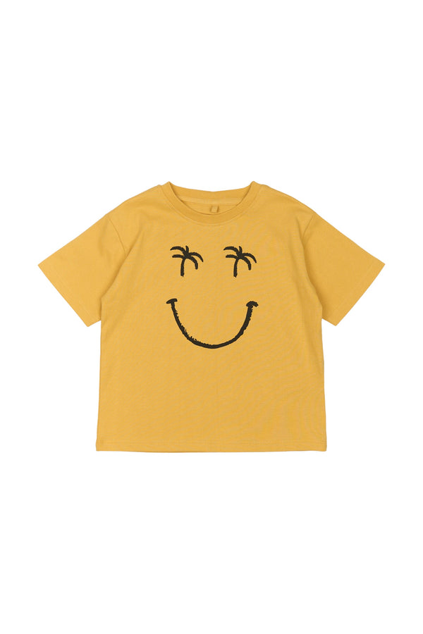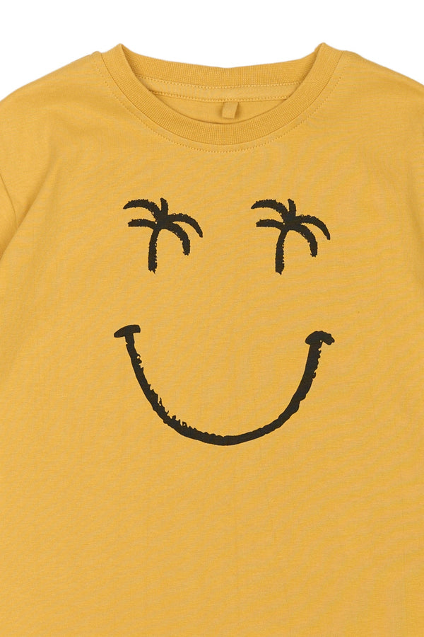 Yellow and vibrant t-shirt for boys who want to add color to everyday life. The smiley with eyes of palm trees adds a stylish and fun look. This t-shirt is perfect for daily wear and adds a cozy and comfortable touch to the child's wardrobe.
