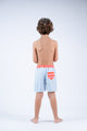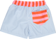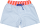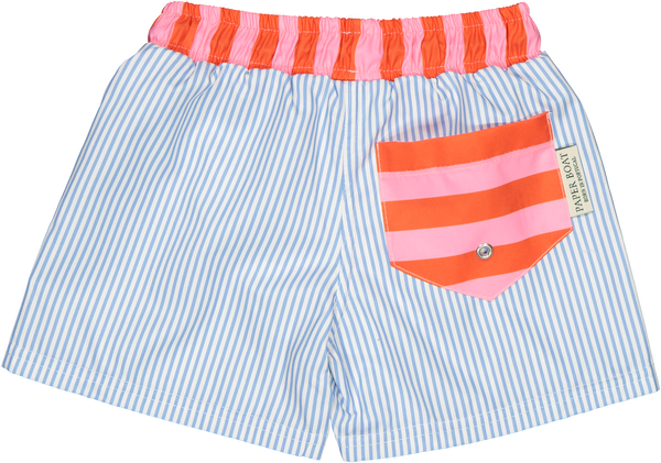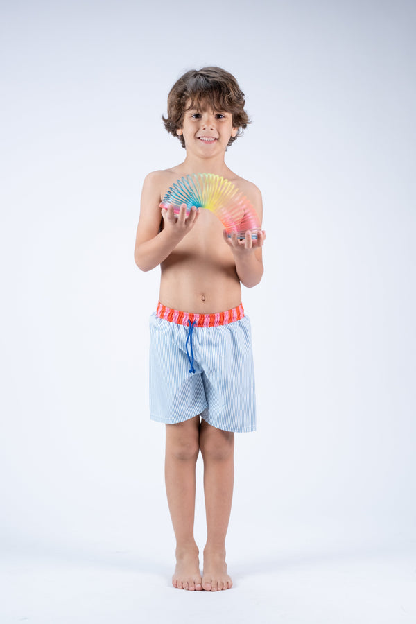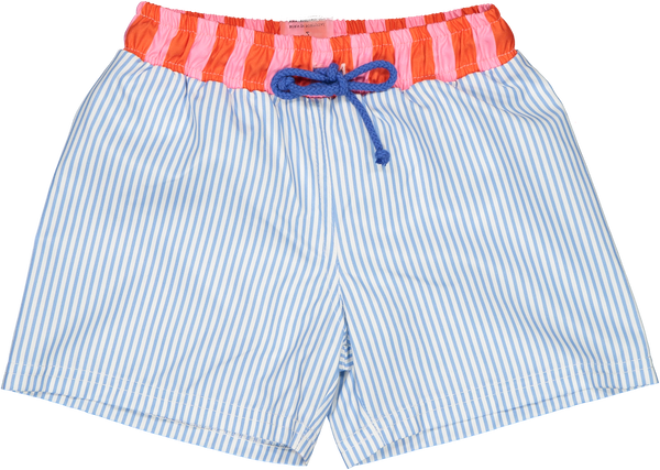 Boy´s swim trucks in blue stripes with red / pink stripes waistband. Adjustable blue lace.
