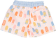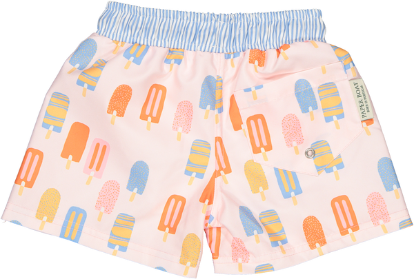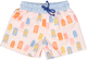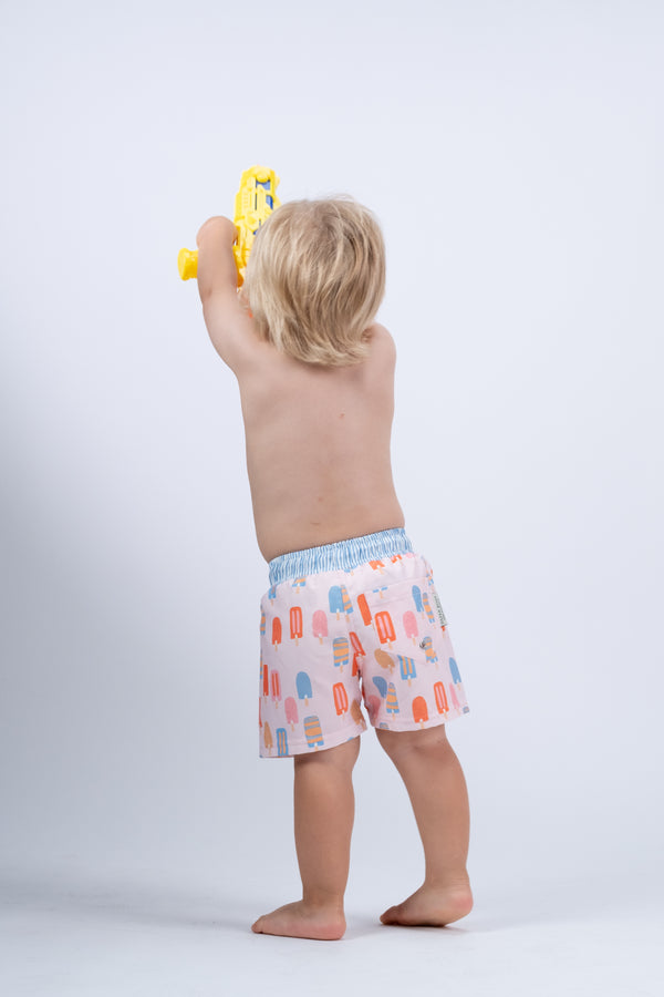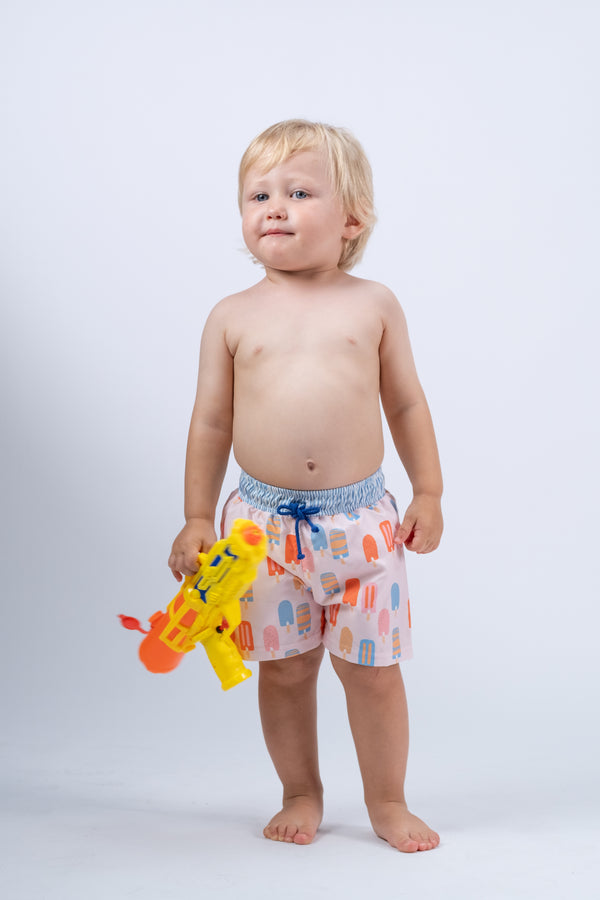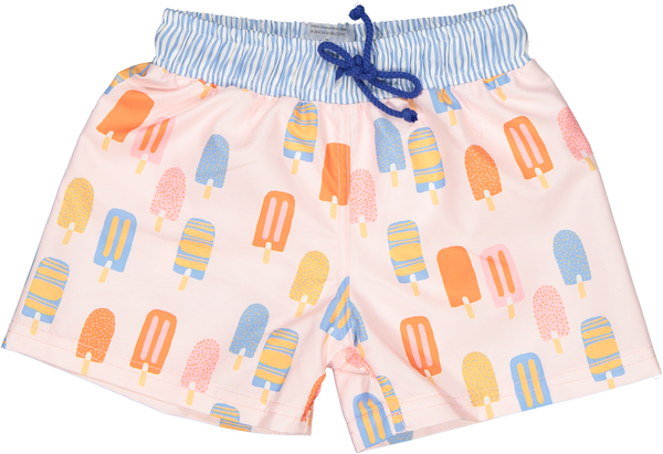 Boy´s swim trucks in coloured ice cream pattern with cornflour blue stripe waistband. Adjustable blue lace.