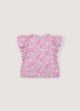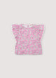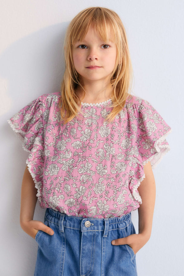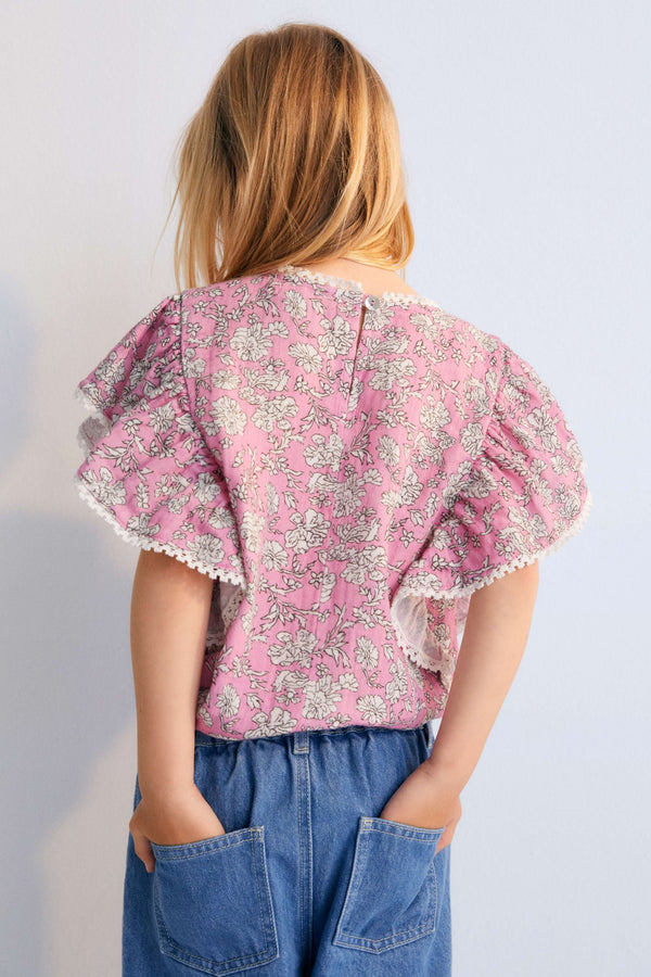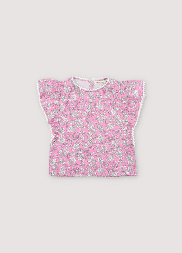 Melina Blouse in 100% cotton muslin with our peony hibiscus print. The blouse features a ruffle from the shoulder to the hem, a high neckline, and lace detail on the neckline and ruffle.