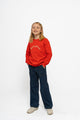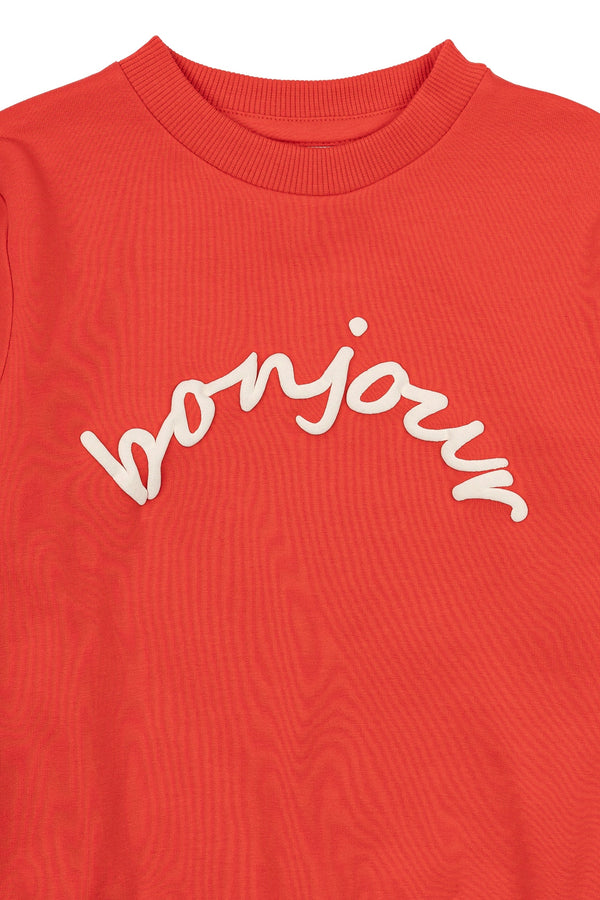 Stylish sweatshirt with a fine embroidery across the chest of the text 'Bonjour'. The ribbed edges along the neckline, cuffs, and hem give the sweater a stylish look and ensure a good fit. It is a warm and versatile sweater that pairs well with a variety of bottoms.
