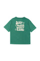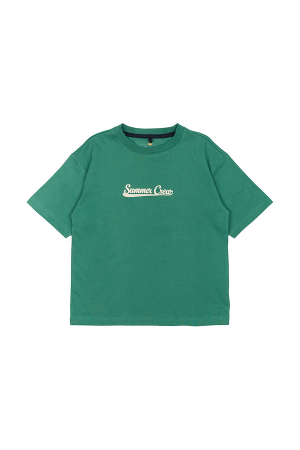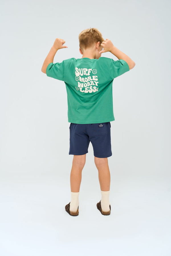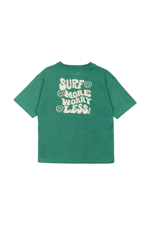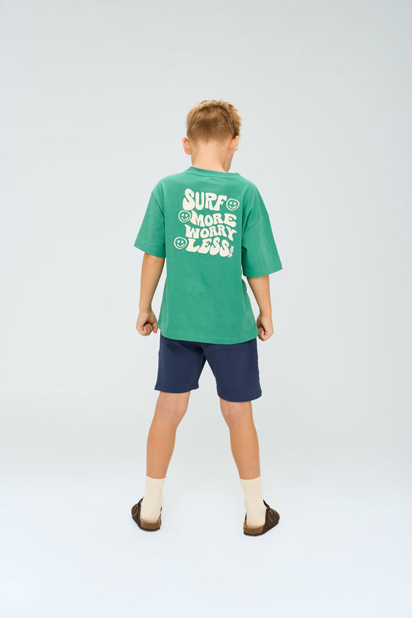 Stylish and comfortable t-shirt with a simple design, featuring a small chest print with the text 'Summer Crew' and a larger print on the back with the text 'Surf More Worry Less' and is perfect for daily wear, adding a cozy and comfortable touch to the child's wardrobe.