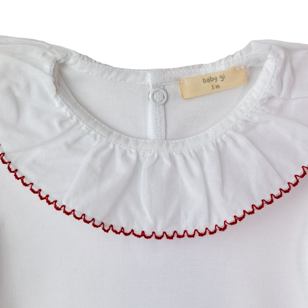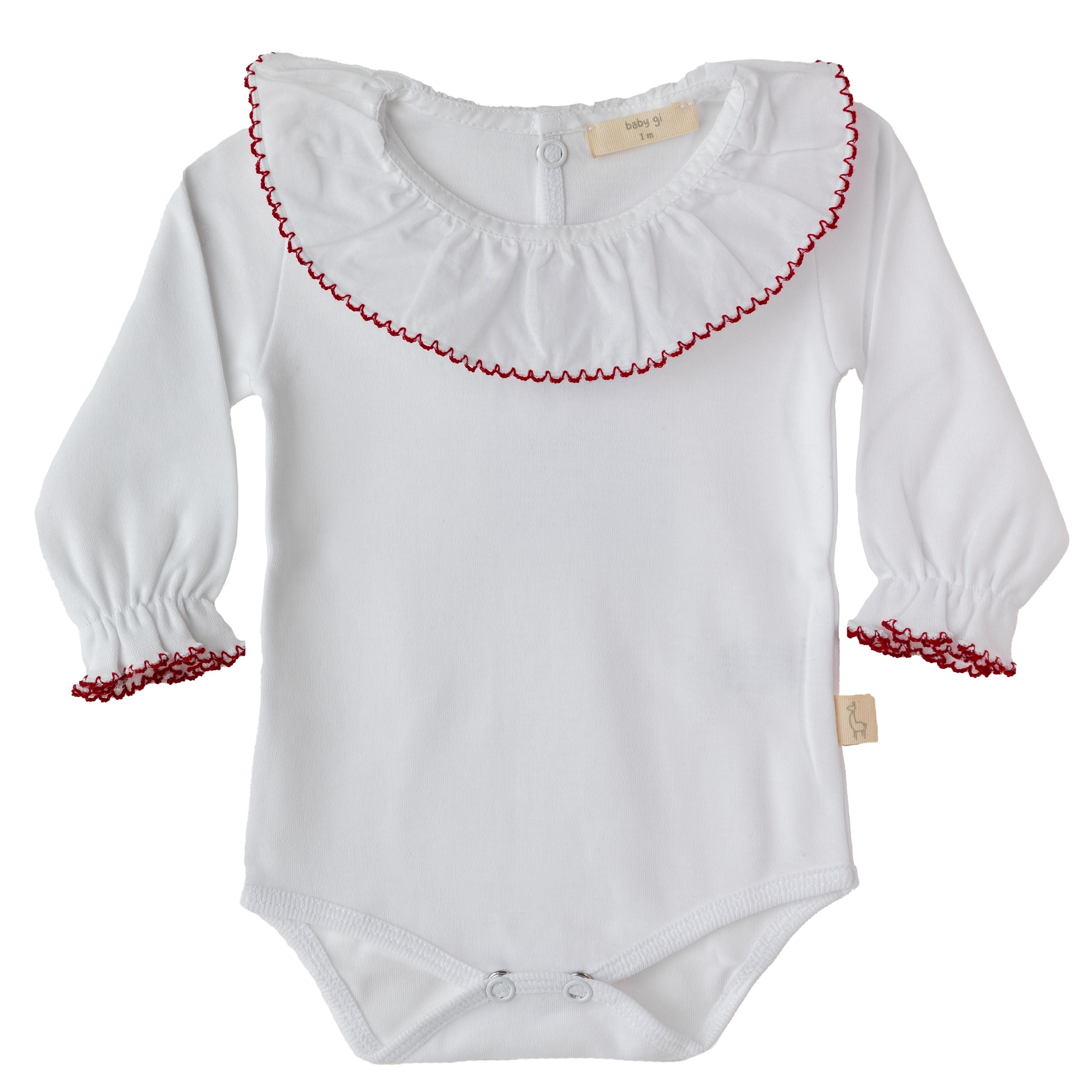White long sleeve Bodysuit with frill collar featuring a Bordeaux red stitch trim and cuffed wrists with matching stitching. Ideal to pair under the Baby Gi Prancer Romper or any other festive outfit.