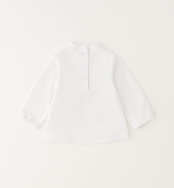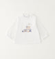 Long sleeve round neck t-shirt with snap fasteners to the back. Featuring a a cute teddy on a bench with a ribbon bow applique. Ideal to pair over a the wide leg jeans, under the lyocell denim shirt or over a pair of short in warmer weather.